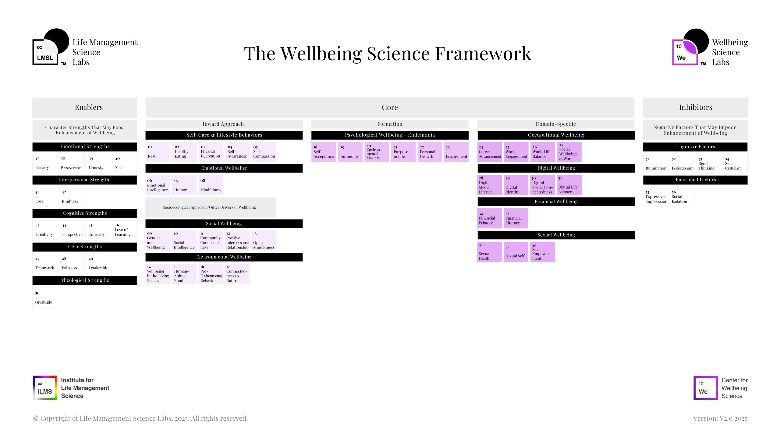 There are multiple domains in life; in each you can optimize your experience and function well. Wellbeing Center sees “well-being” not as an abstract idea: well-being can be applied across various domains, including work-related wellbeing, social, emotional, and environmental wellbeing, and so on. The center encompasses all these different domains and gives a picture of life so that people can see that it is possible to optimize their experience in multiple/separate areas. We started from scratch; currently have 16 domains and 56 elements that involve personal capabilities/resources (inward approach), outer resources (socioecological approach), transactions between individuals and their surroundings, and optimal functioning in specific domains.