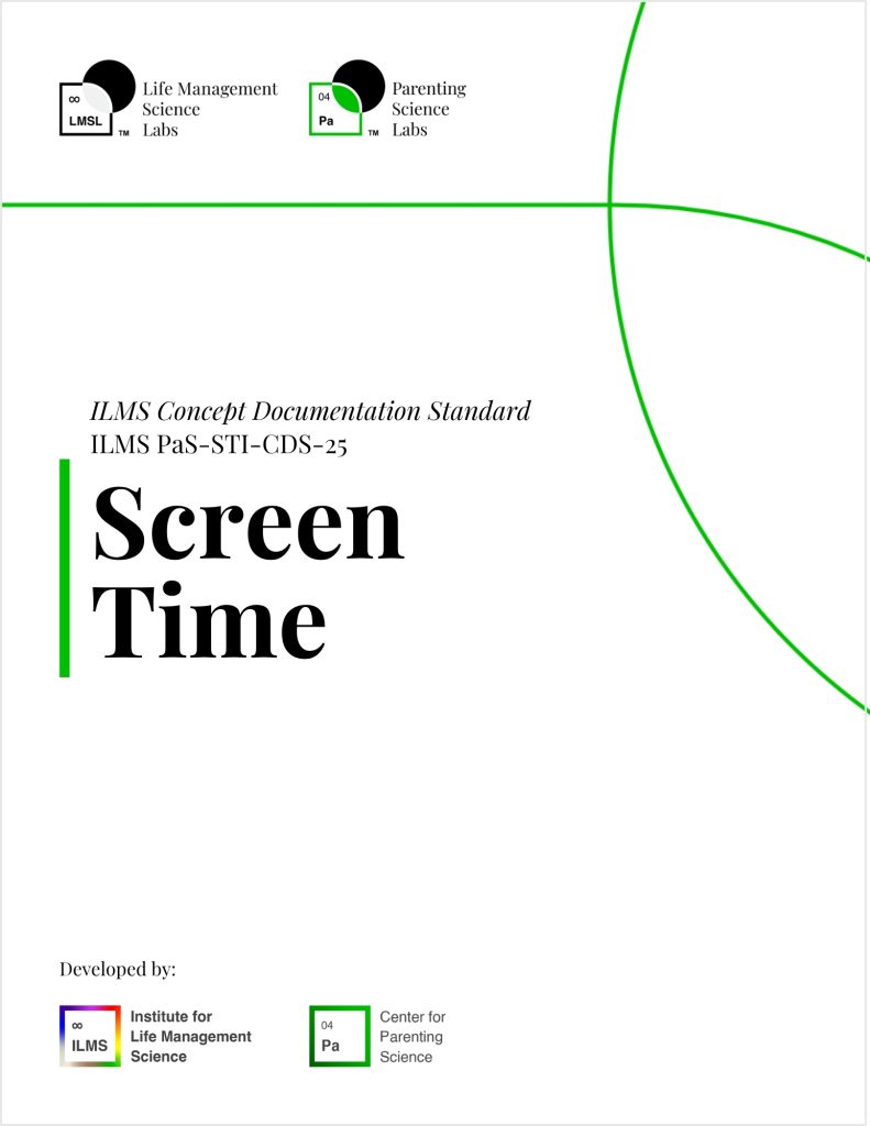 Screen Time ILMS Concept Documentation Standard ILMS PaS-STI-SD-24 will help you navigate the challenges of excessive screen time and discover effective strategies to manage screen time, promote healthy habits, and strengthen family connections. This course is a part of the Parenting courses within the 82 elements of The Parenting Science Framework Fundamentals. This is a structured document describing the best way to navigate and understand the element. It outlines and explains concepts, such as: definitions, related concepts, taxonomy, misconceptions, challenges, habits and recommended practices.