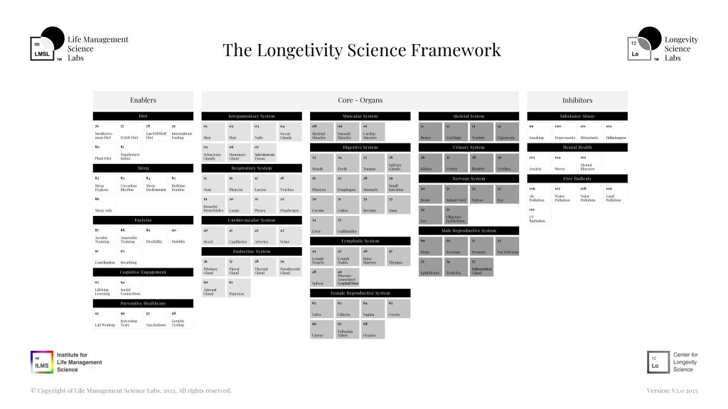 With its 20 domains and 110 elements, the framework provides a thorough exploration of various health and wellness dimensions. Central to this are the Core-Longevity areas, which cover essential aspects such as optimizing nutrition, developing personalized exercise regimens, pursuing stress management techniques, and making informed healthcare decisions. Each component is carefully structured to offer actionable insights, ensuring that you can effectively navigate and achieve your longevity goals while enhancing your overall well-being.